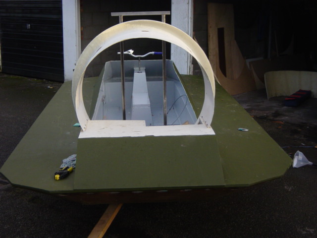 I don't have any photo's from when we first got the hull, there's been a lot of work to this point. All these photo's are of about the same stage. A tank theme was decided the day we picked up the hovercraft, based on Oddball's tank from Kelly's Heroes. Rather than a Merkin or English flag I'm having a Jolly Roger |