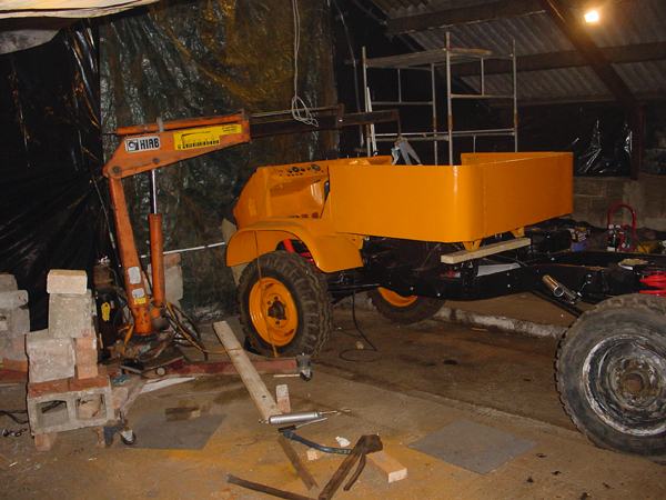 So we start dangling the cab on. The steering box has been removed and dropped to the floor, then we can just drop it straight on. I have to admit to a few nerves doing this - a heavy lift for the hiab, and after all the welding - is it still straight! |